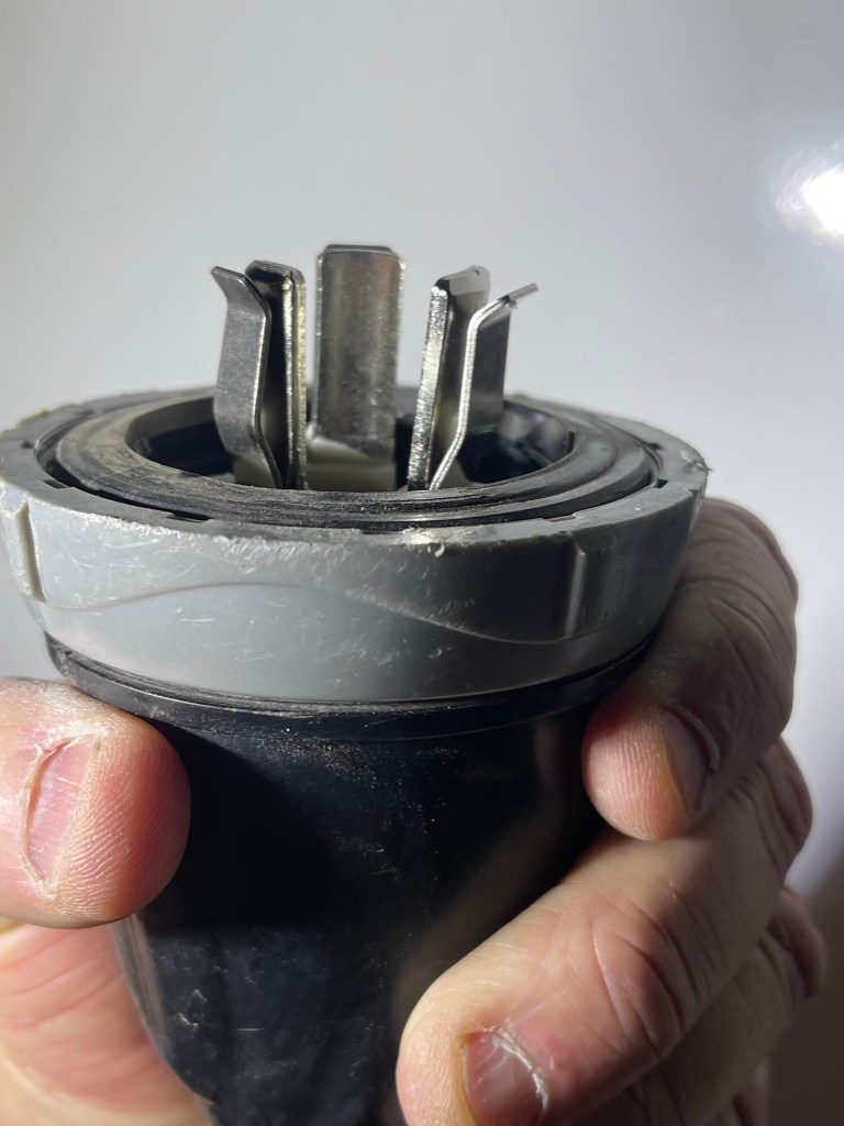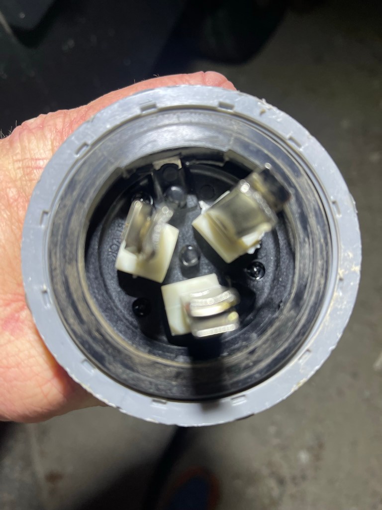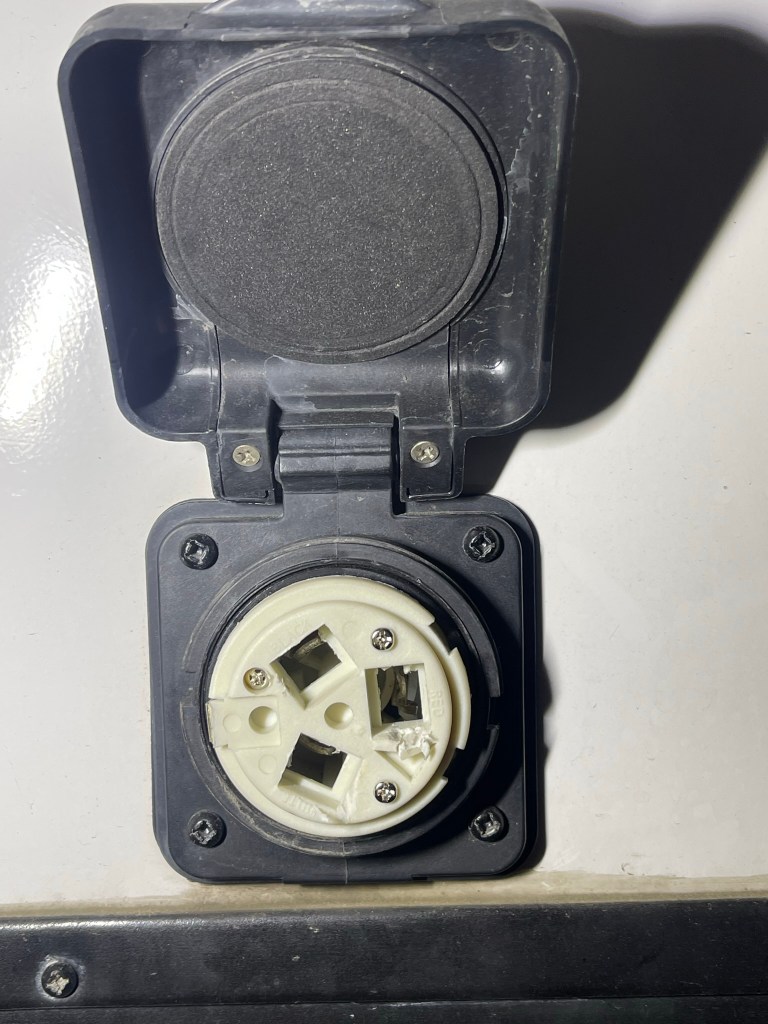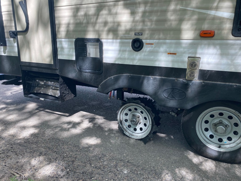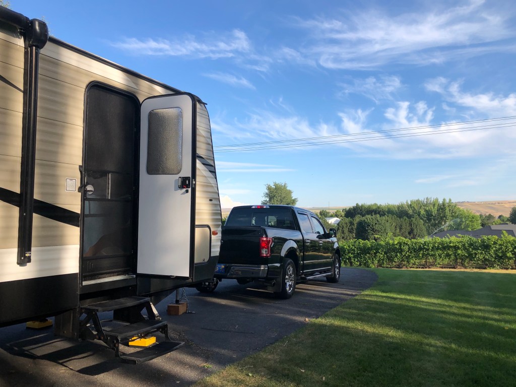 The idea, before going to bed, was to pull the trailer forward a few feet, maybe 8 feet, so the trailer was off the side dirt and more level on the driveway. Thus, we could have the trailer fully hooked up to the Ford F-150, have only one of the two slideouts open, wake up at 3:45 am, pull in one slideout and hit the road. We disconnected everything but left the electric power cord cable still hooked up to the trailer only. My idea was to save the infinitely small amount of time of fully unhooking the electric and just have my wife hold it while I rolled forward. However, my wife dropped part of the cable and of course it went under the camper tire and pulled the cable right out of the socket on the trailer.