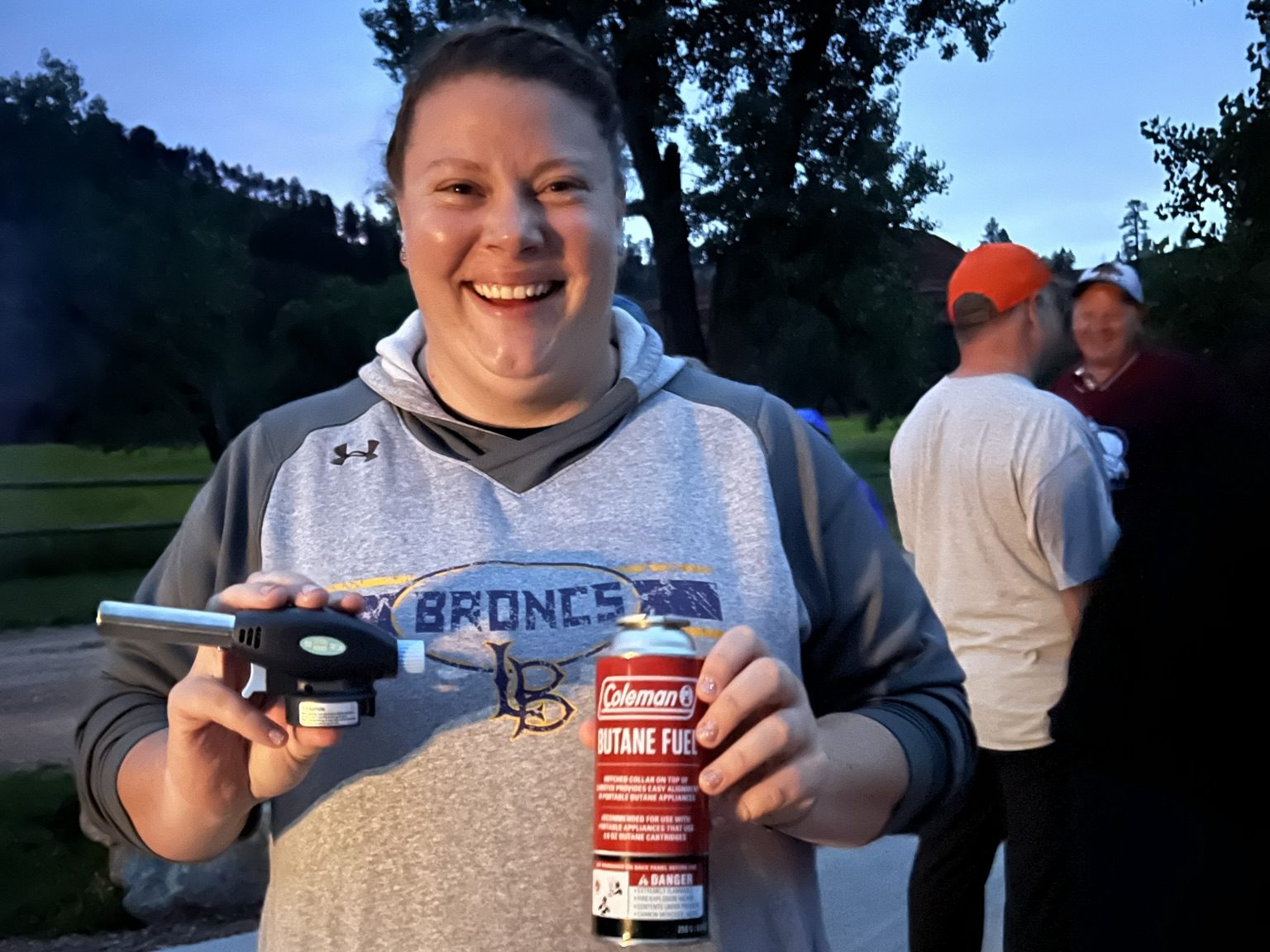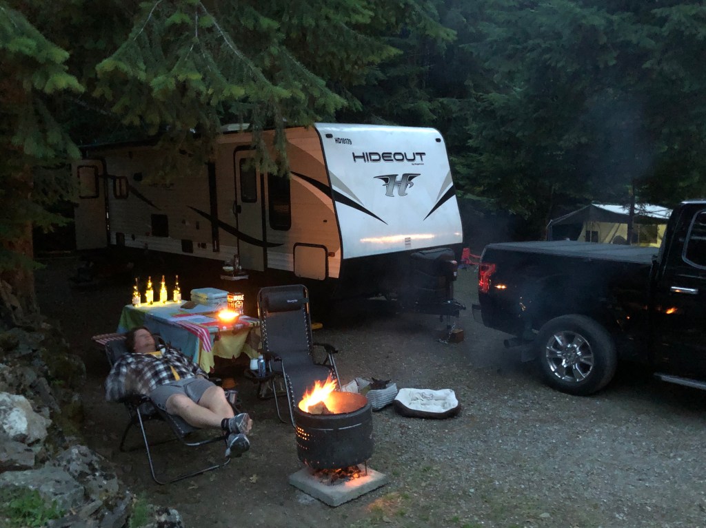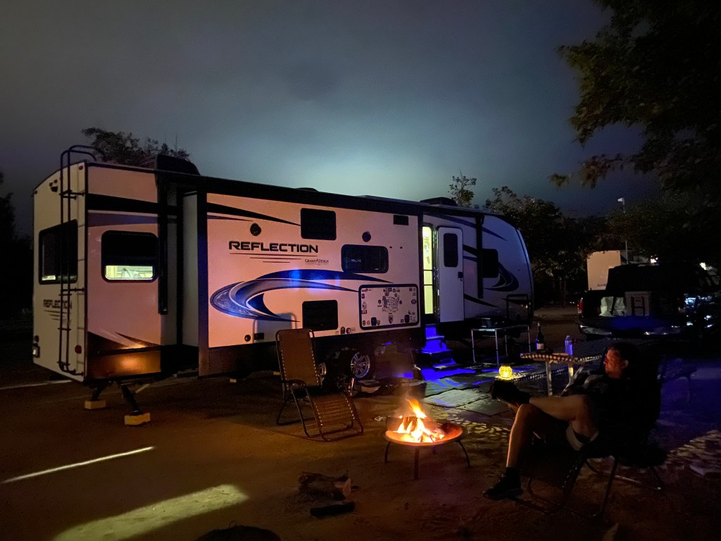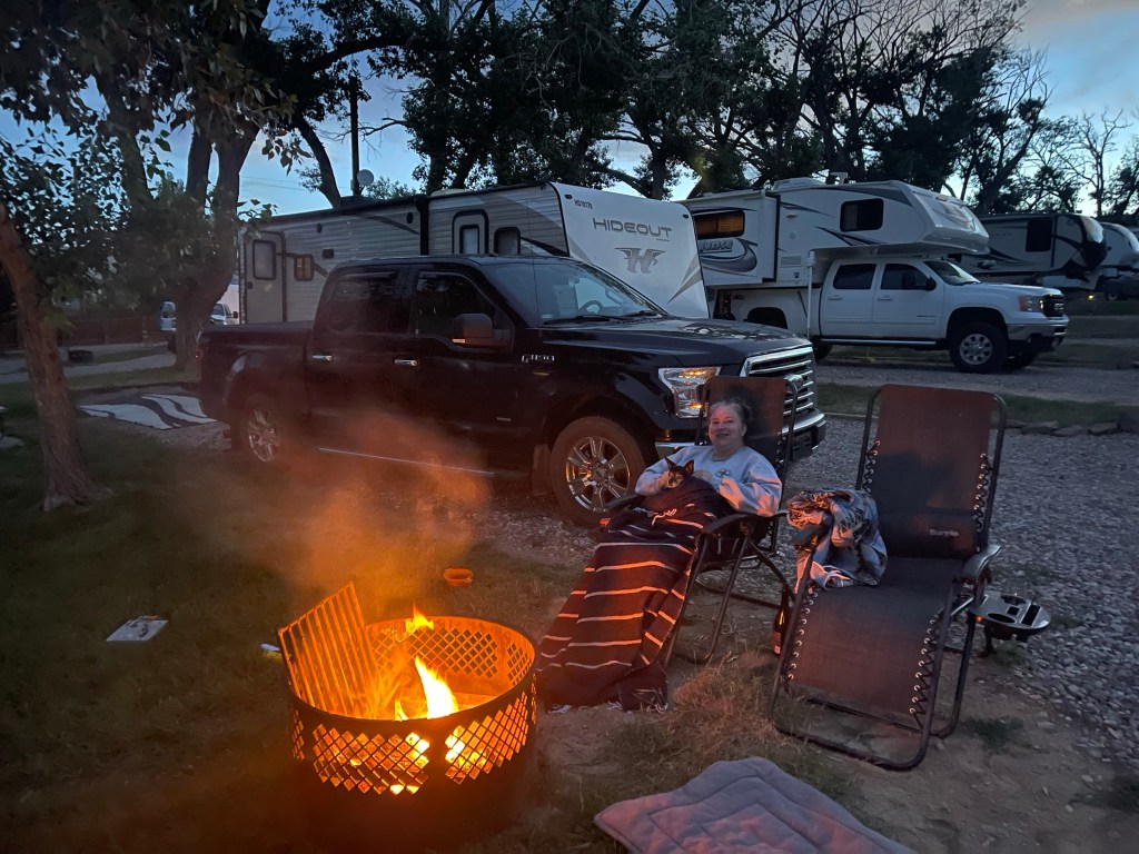 That first night, everybody came over with cocktails and appetizers and we just sat there chit chatting and staring at the tower. Later on in the evening, I tried to start a fire in our portable fire pit and was having trouble. Now, when I asked the people working at the campground if we could have fires they didn’t exactly say no or yes. So, I figured I’d start a fire until somebody shut us down. Luckily, that never happened. Well, after struggling to keep the fire going, a neighbor, 28 year old Katelyn, and her mom who were tent camping nearby saw us having trouble, they walked over and offered to use their Coleman butane blow torch on our fire. Within 2 minutes, the thing was up and blazing away. We invited Katelyn and her mom over for drinks and snacks, and the next thing I knew, we had a little impromptu party of 11 people going on. It was a lot of fun and the best night of the trip. The really cool part was the sky kept changing colors as we partied on.