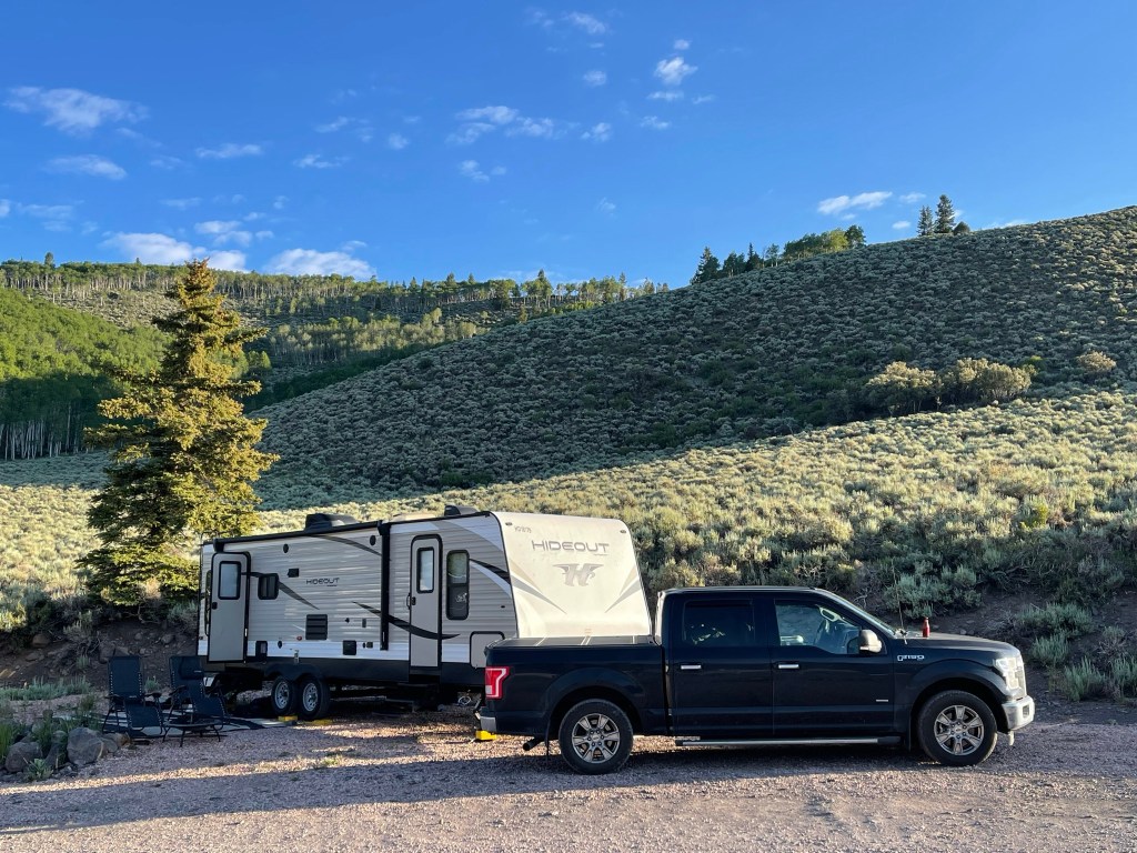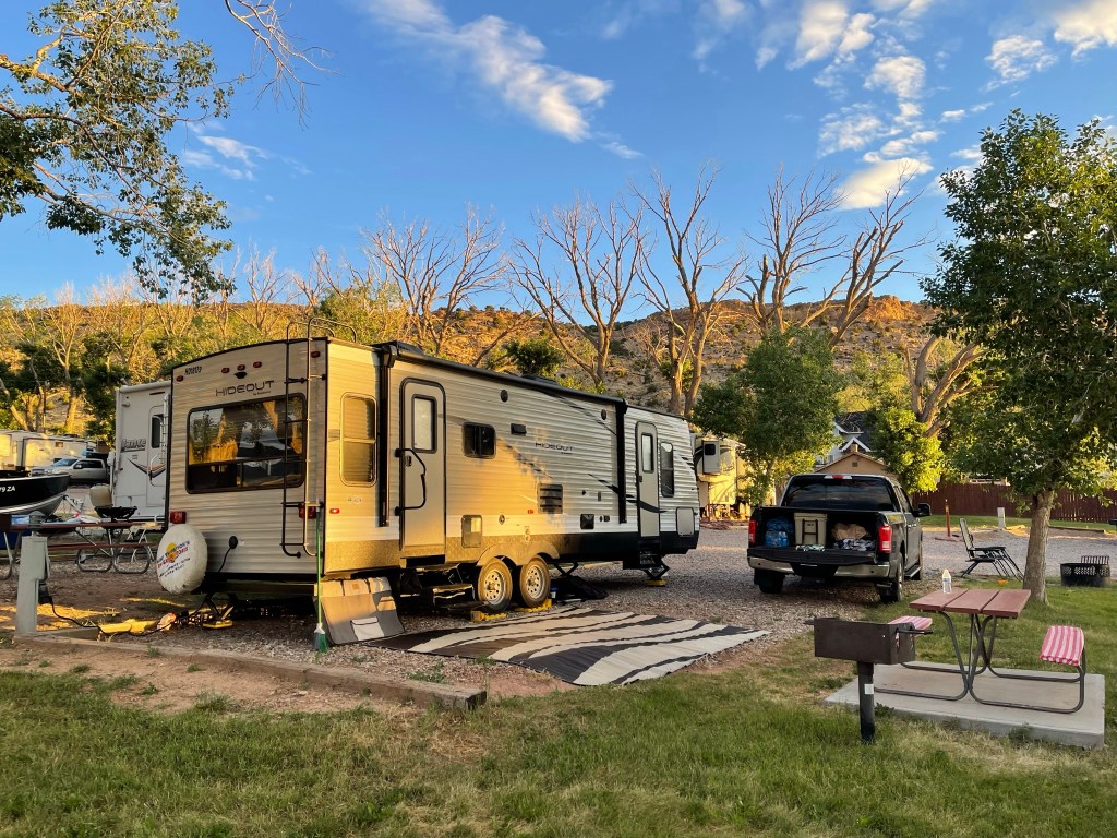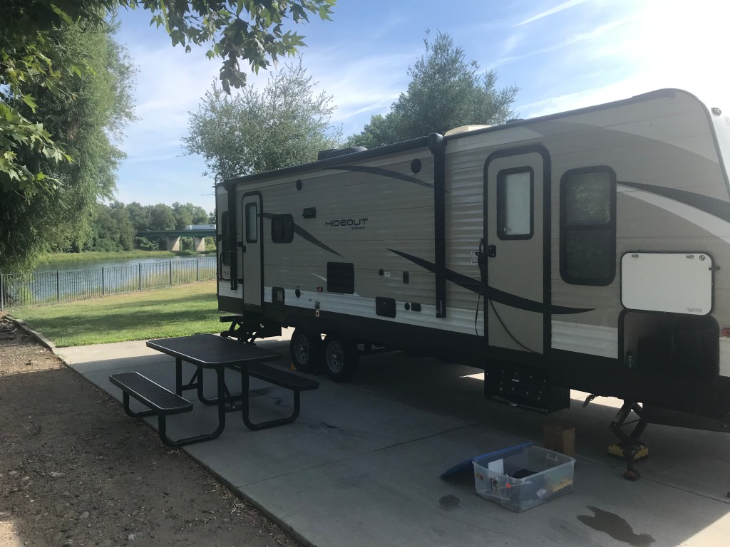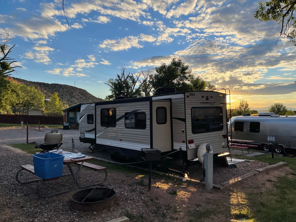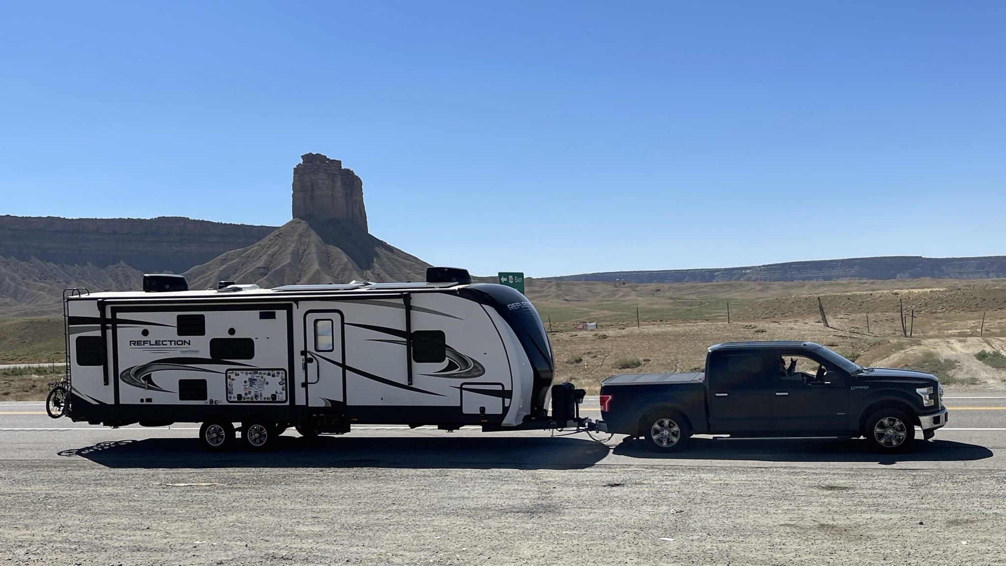 “STOP!!!” my wife screamed. I slammed on my brakes even though I was only going 3 mph. It was 10 o’clock at night in Canyon Country, CA, where my folks live and where we store our 33 foot Grand Designs Reflection, travel trailer. The plan was to meet my wife with the dogs at my folks house Thursday night after work, finish packing for our 3 week trip, sleep a few hours and be on the road by 4 am. We had a little 762 mile car ride that first day which would put us at Brigham City/Perry South KOA, the very north end of the Great Salt Lake by 4 pm.