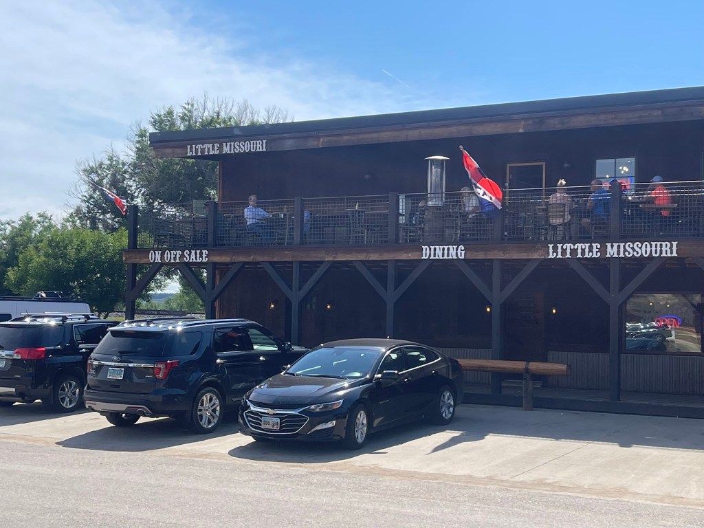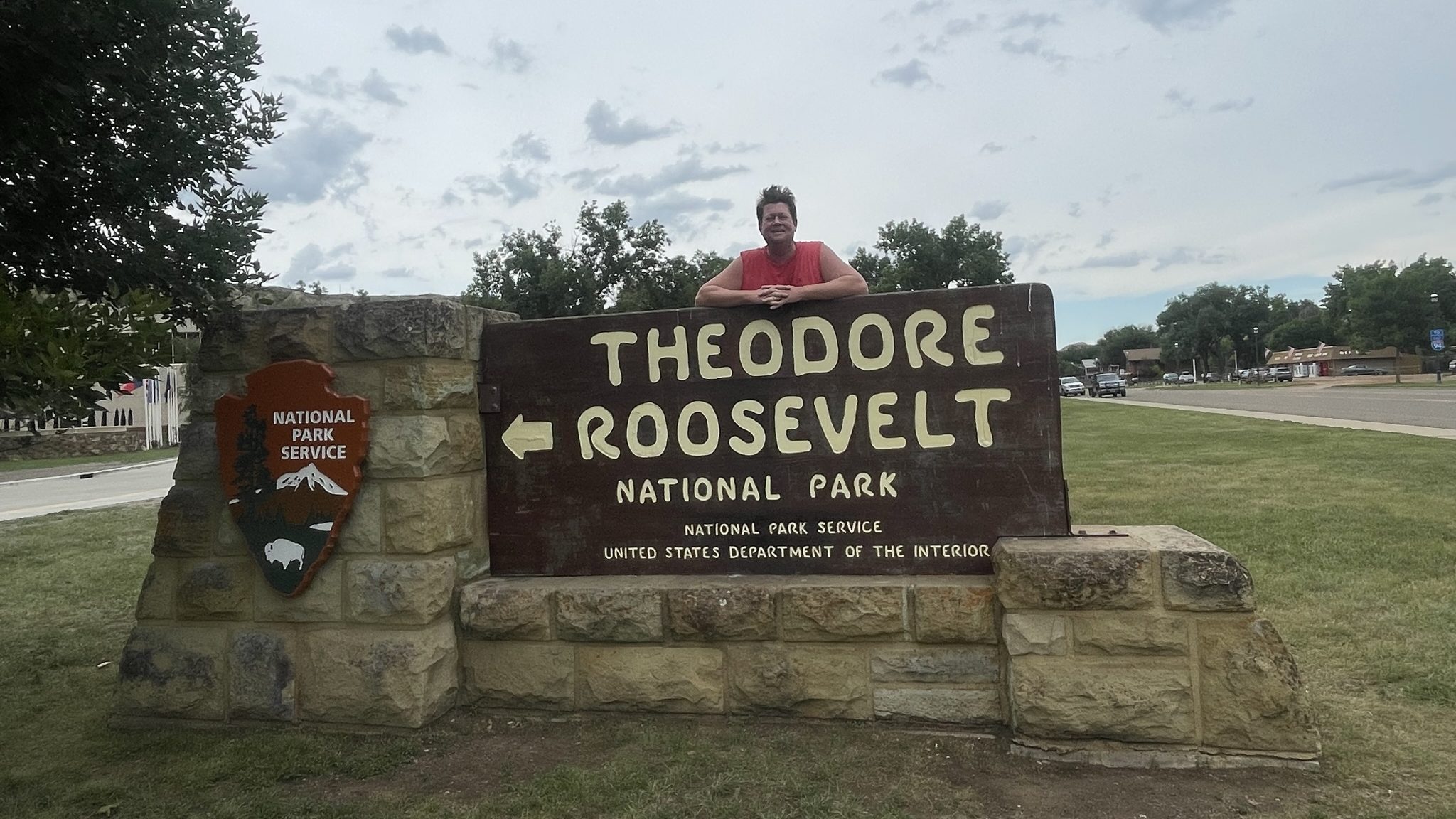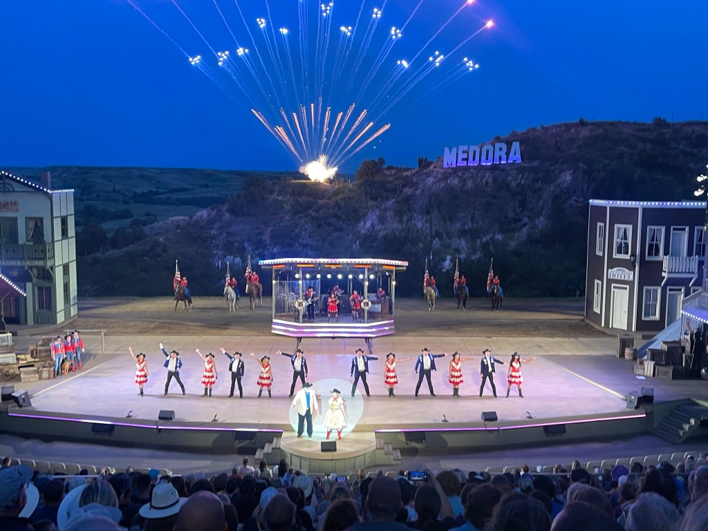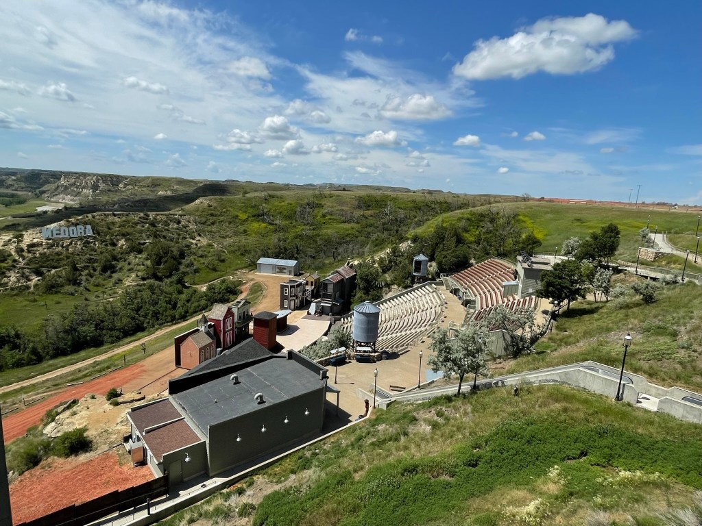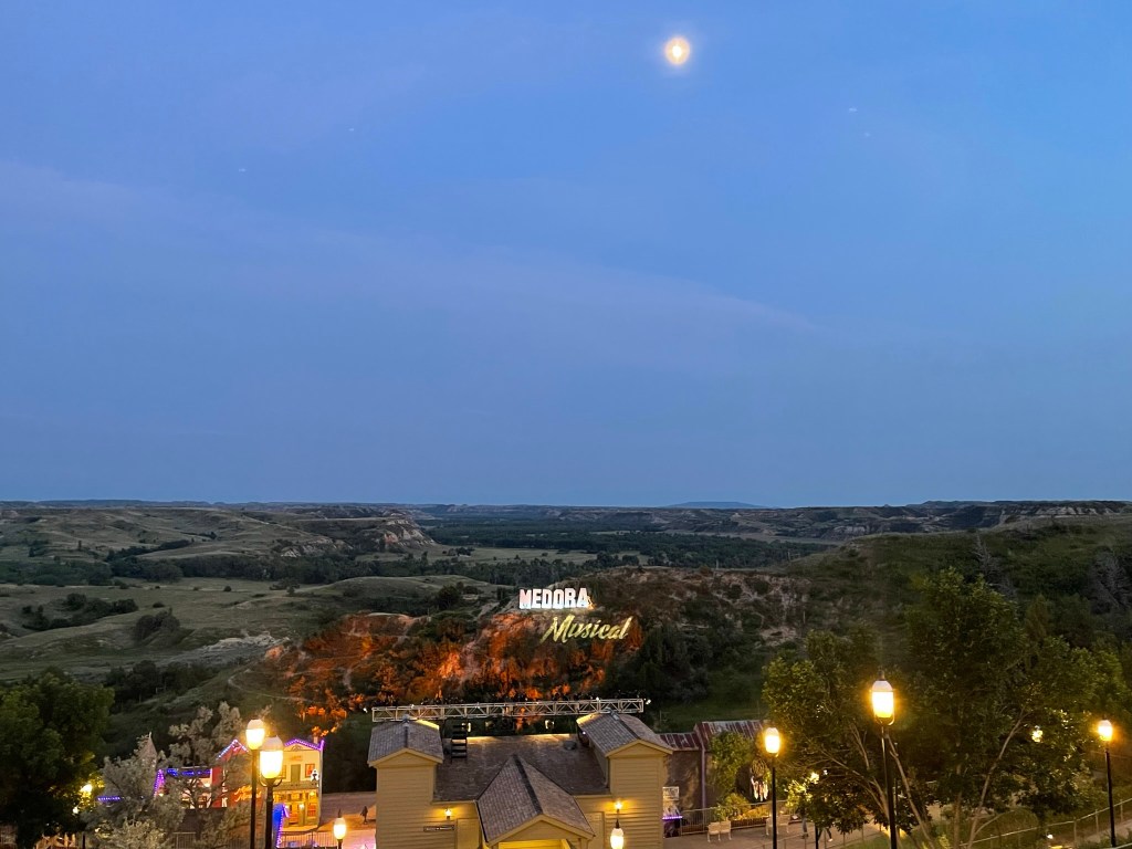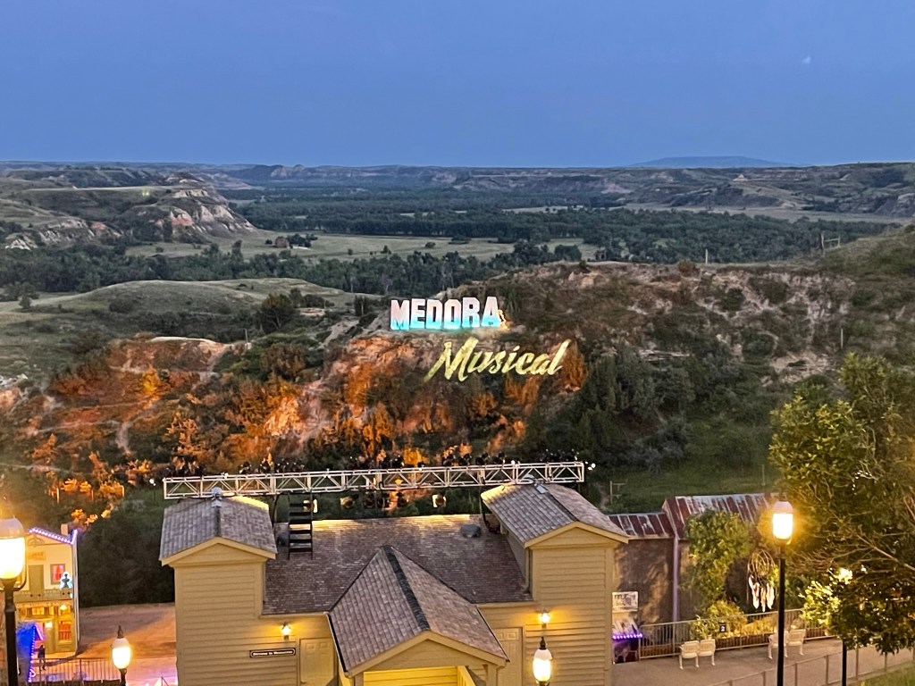 Lisa wrapped up early and we both ebiked around town, hitting a few of the bars in town before going to see the state famous “Medora Musical” at Burning Hills Amphiteatre, located 5 minutes from the CG. During my research for the trip, I found out that this musical explains through song how Teddy Roosevelt came to discover North Dakota and got so inspired from living here on and off for 2 years that when he later became president, he created the National Park system to preserve our lands and its animal residents. Well, for $50, you get a ticket to the show, but for an additional $35, you can eat right by the theatre 90 minutes before the show. We did the meal as well which I highly recommend. It was a cafeteria / buffet style serving fondue steak, baked beans, garlic bread, fruit, salad, and baked potatoes. The drinks you pay on the side, but they had water, soda, beer and basic cocktails. The food was excellent, the view of the prairie lands beautiful and the vibe with all the other patrons was welcoming. After dinner, you simply walked about 50 yards and you’re at the theatre which had a sign similar to the Hollywood sign that was in the background behind where the musical was performed.