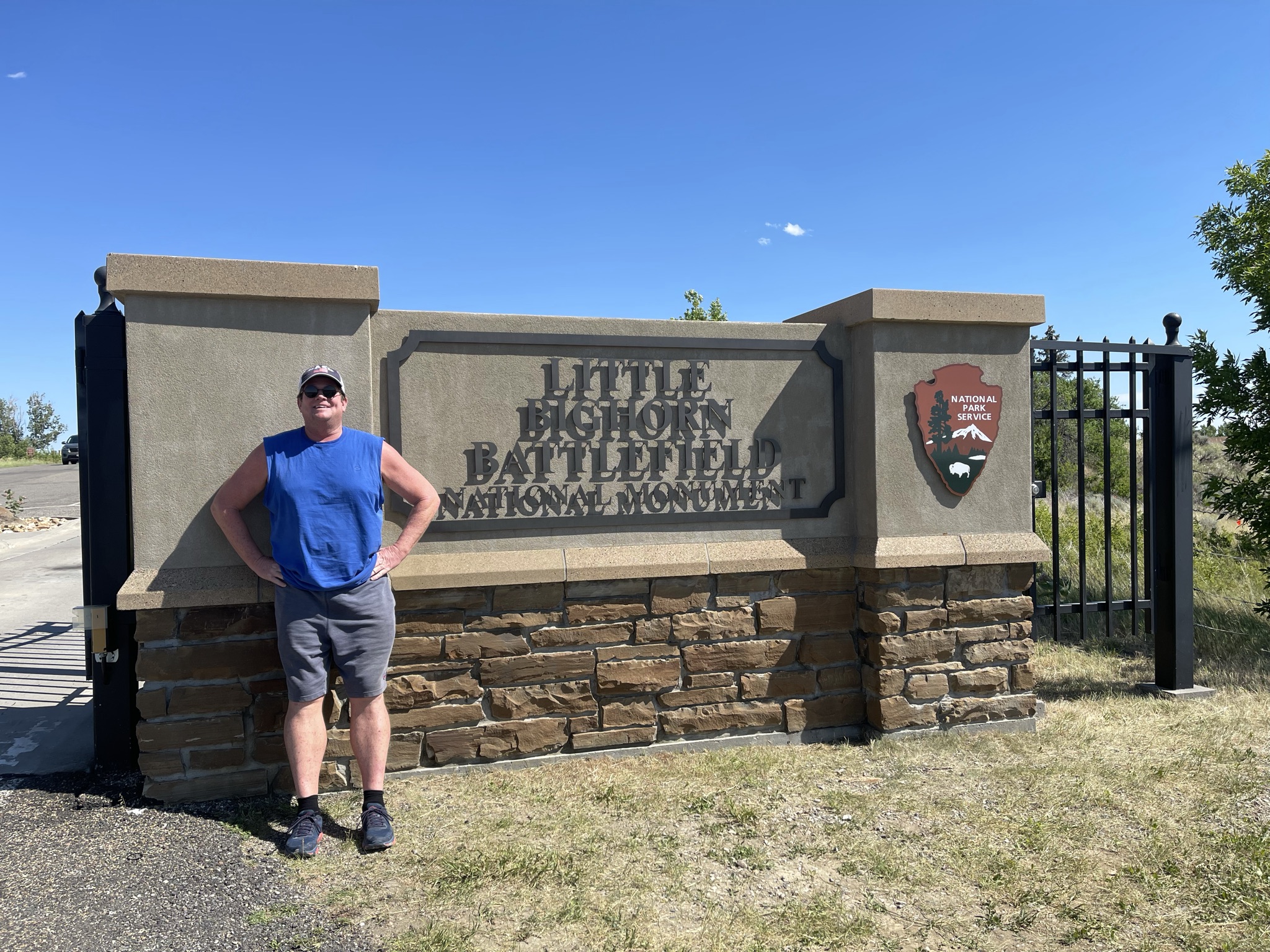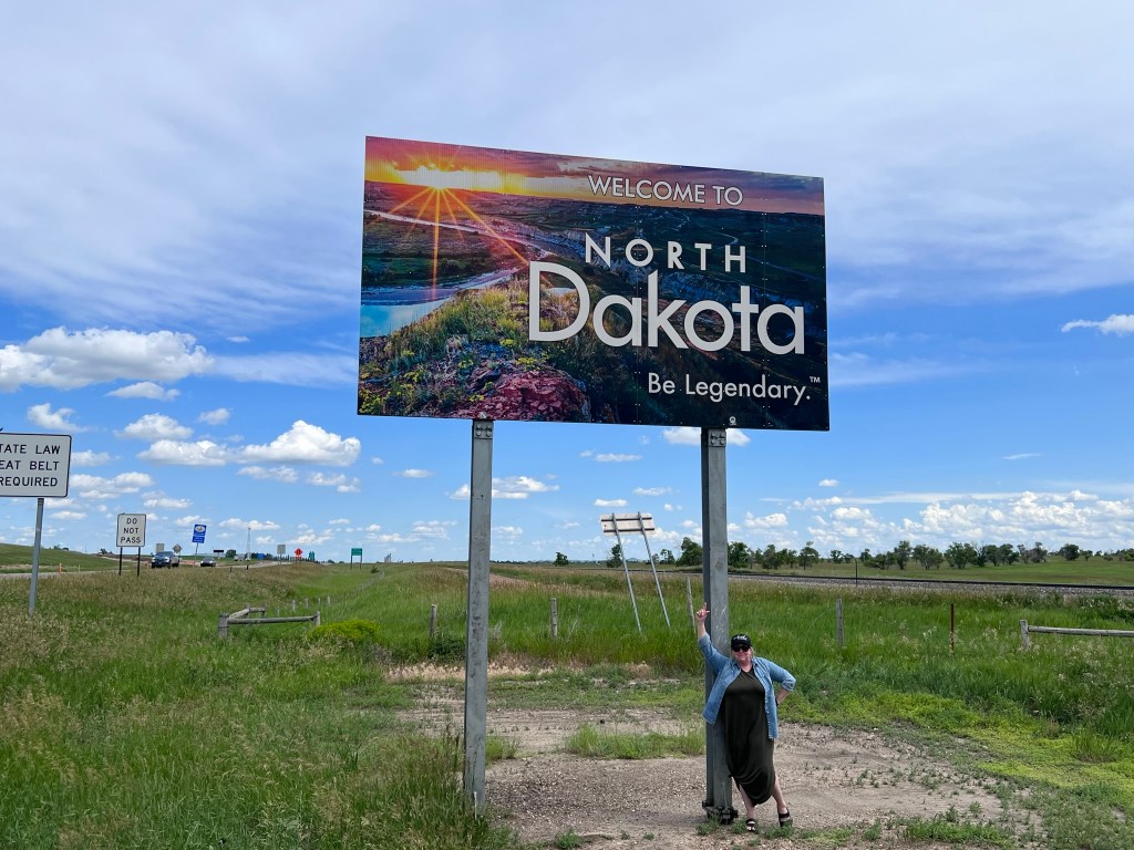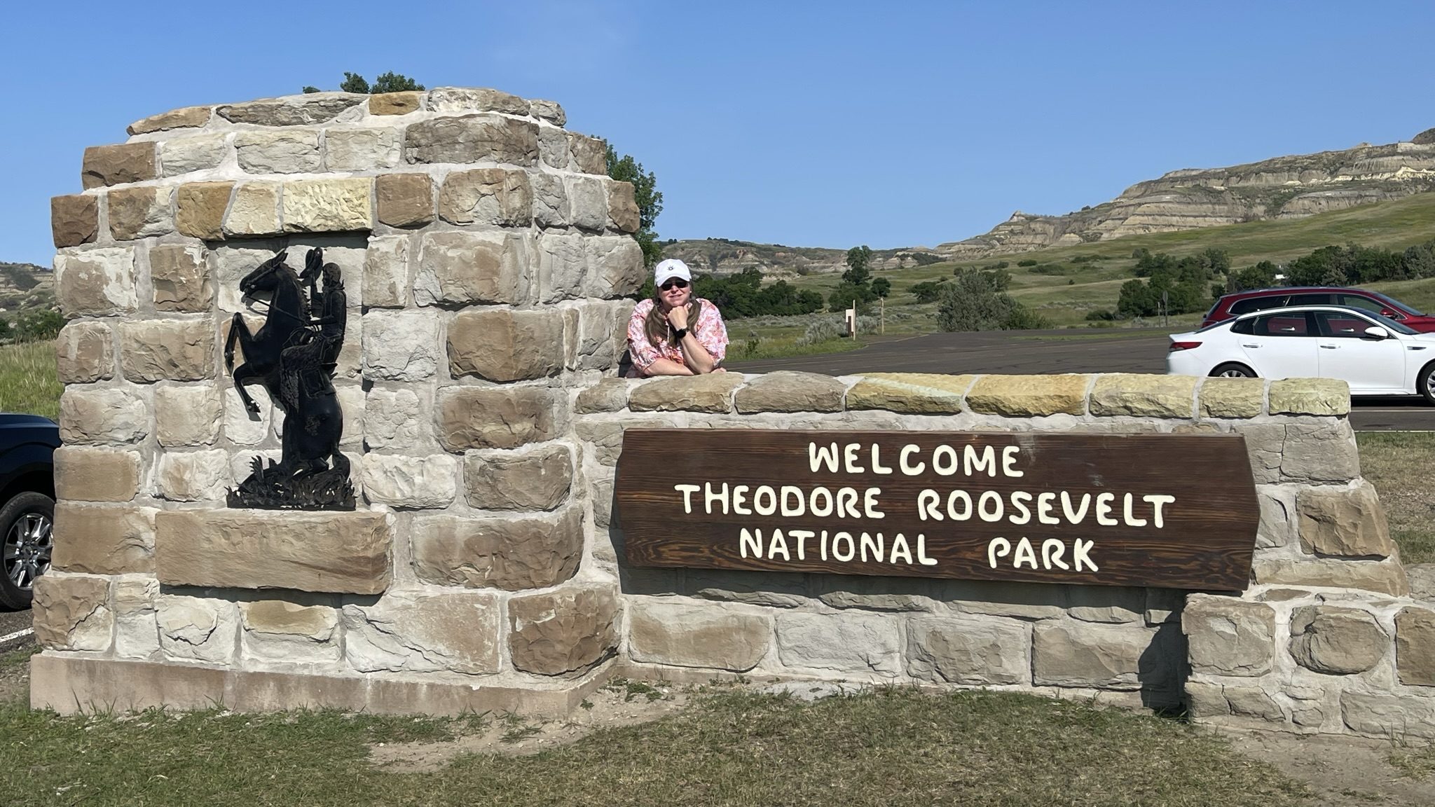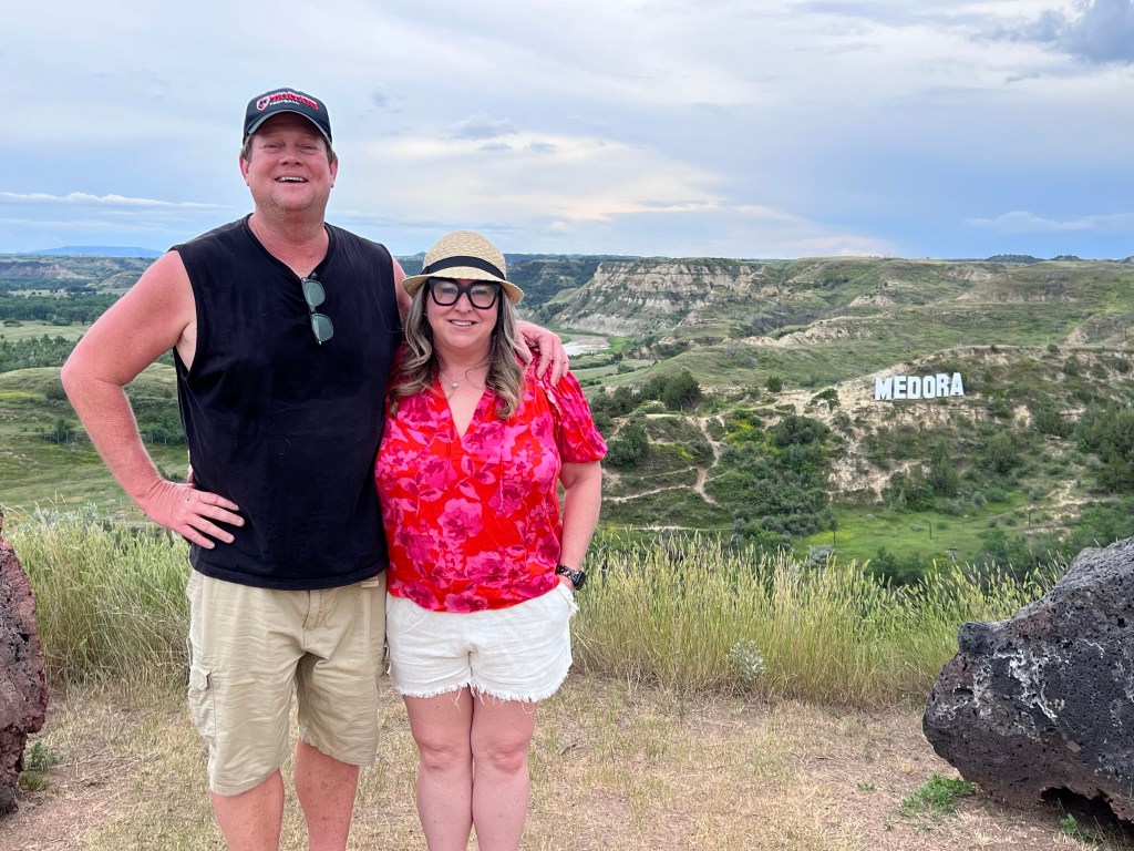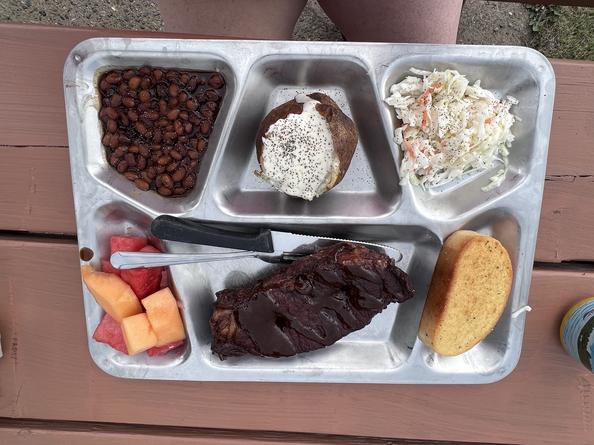 Lisa wrapped up early and we both ebiked around town, hitting a few of the bars in town before going to see the state famous “Medora Musical” at Burning Hills Amphiteatre, located 5 minutes from the CG. During my research for the trip, I found out that this musical explains through song how Teddy Roosevelt came to discover North Dakota and got so inspired from living here on and off for 2 years that when he later became president, he created the National Park system to preserve our lands and its animal residents. Well, for $50, you get a ticket to the show, but for an additional $35, you can eat right by the theatre 90 minutes before the show. We did the meal as well which I highly recommend. It was a cafeteria / buffet style serving fondue steak, baked beans, garlic bread, fruit, salad, and baked potatoes. The drinks you pay on the side, but they had water, soda, beer and basic cocktails. The food was excellent, the view of the prairie lands beautiful and the vibe with all the other patrons was welcoming. After dinner, you simply walked about 50 yards and you’re at the theatre which had a sign similar to the Hollywood sign that was in the background behind where the musical was performed.