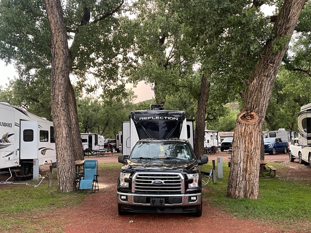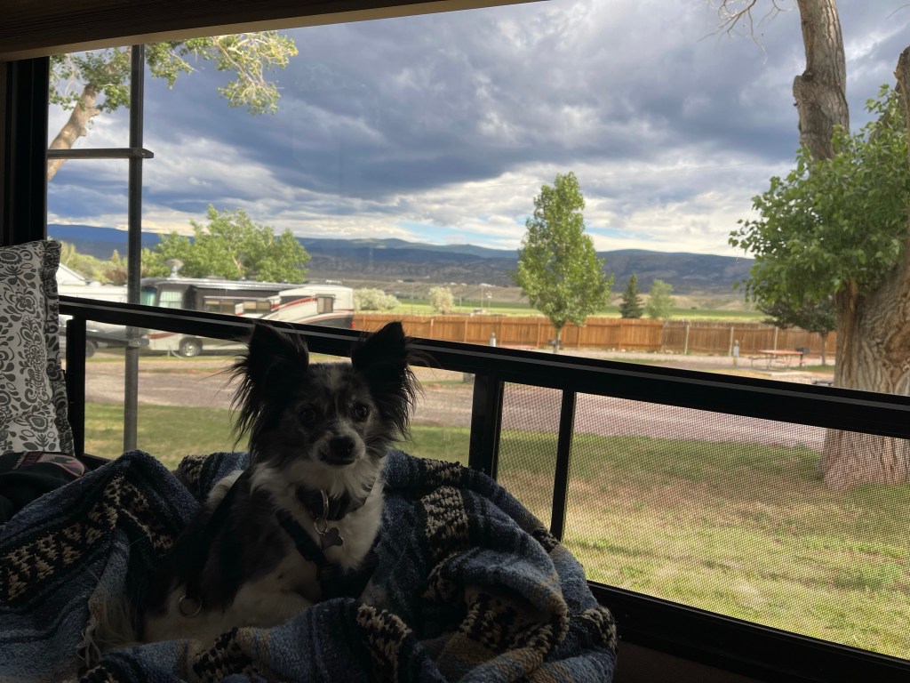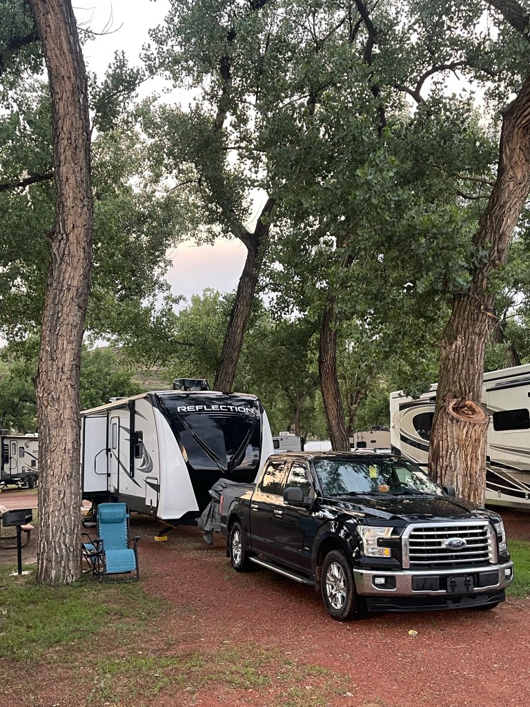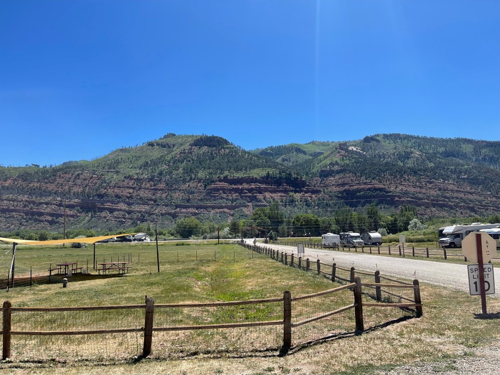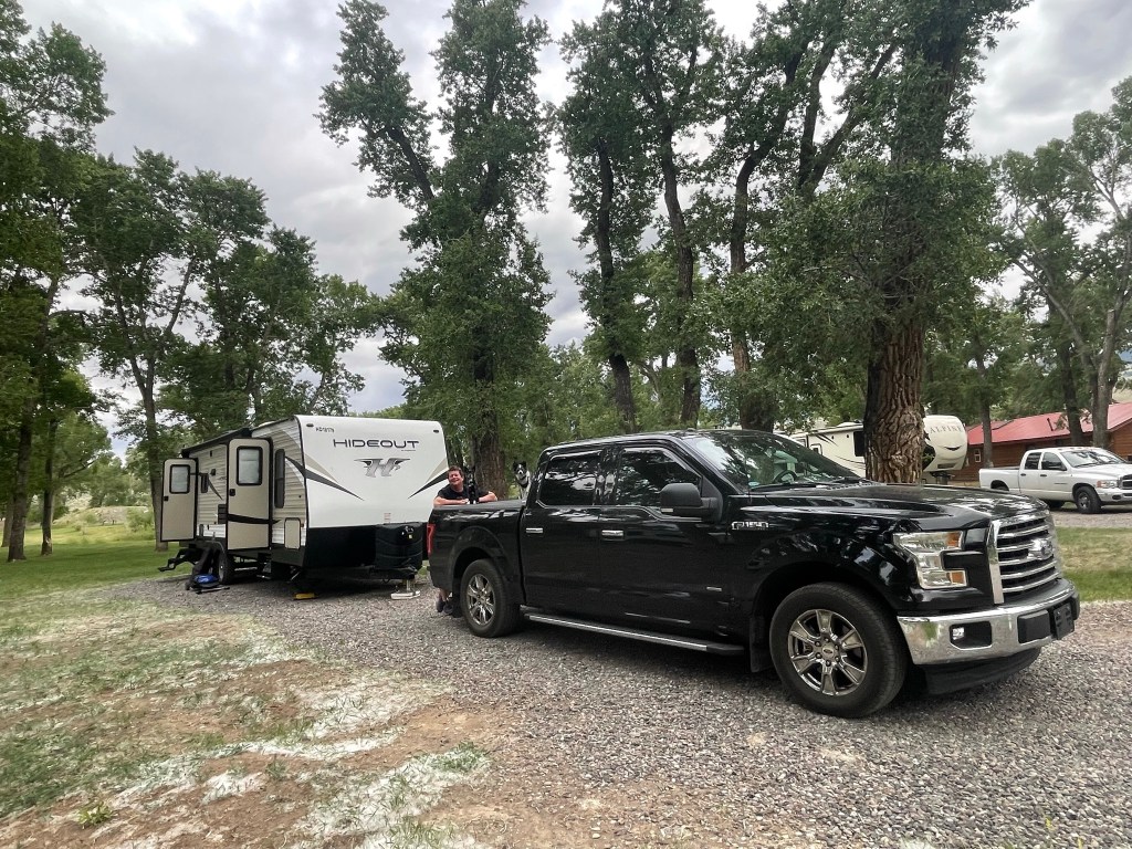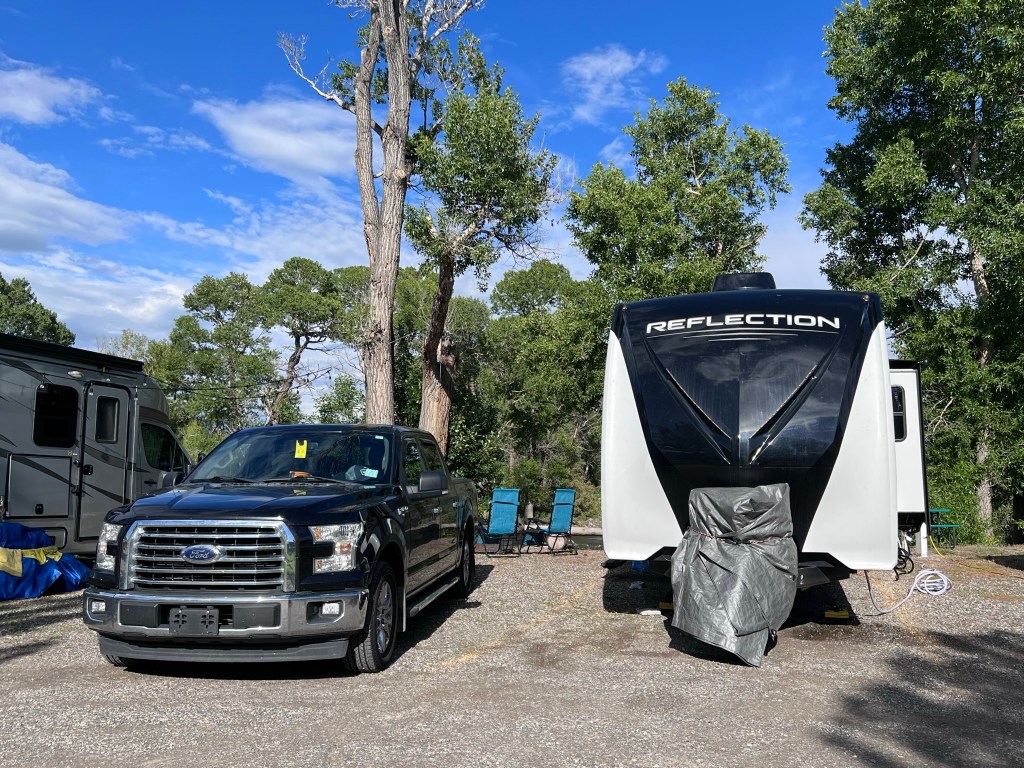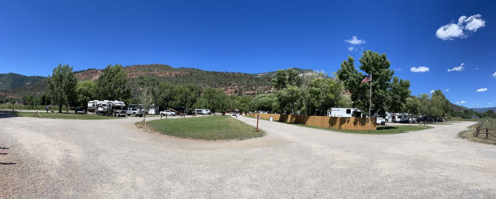 The next day we left at 8 am and drove 361 miles for about 7 hours. This part of our trip was up and over the Rockies, so the truck crawled over some parts. Still, it was beautiful scenery for the most part. We got to Alpen Rose RV Park just north, outside of Durango, CO, at 5 pm, set up camp and hit the above ground pool to cool off.