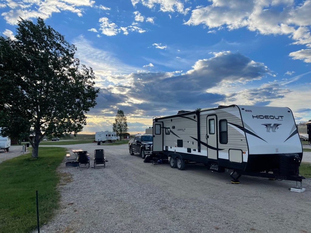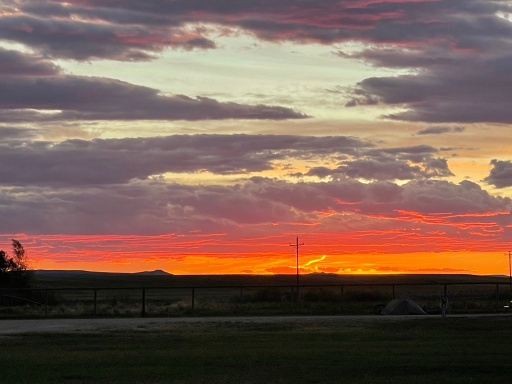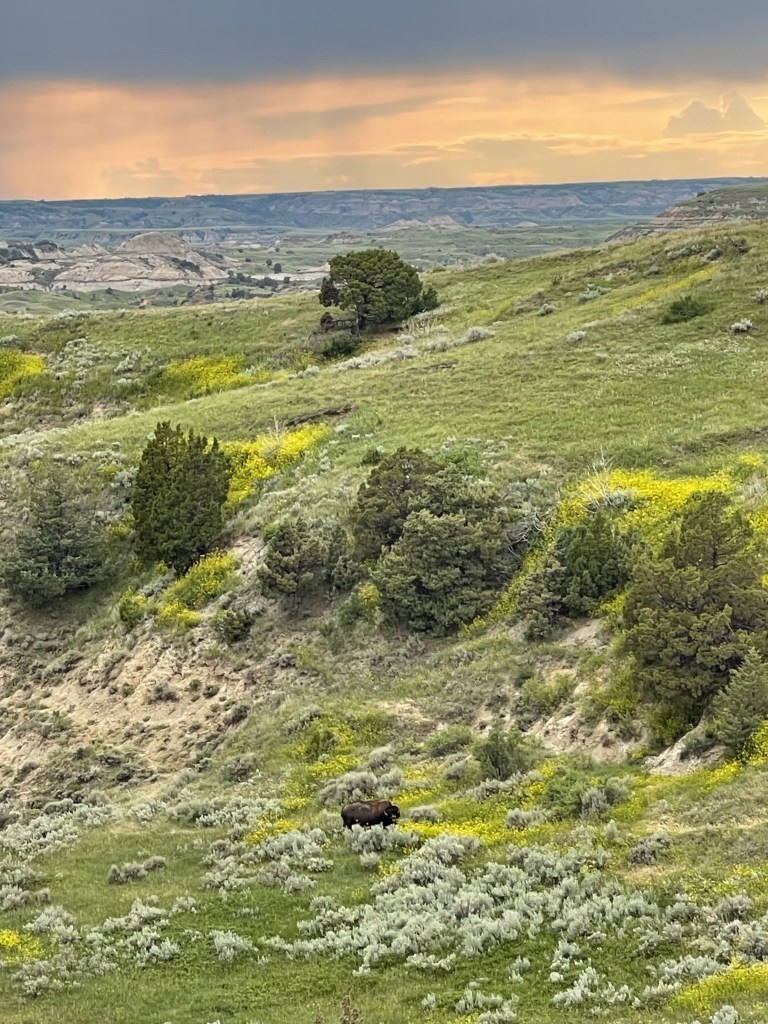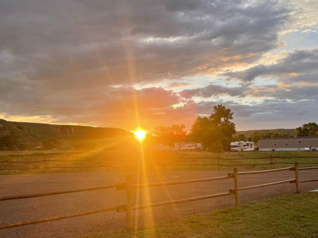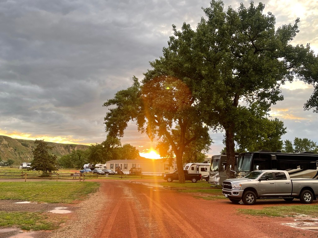 We stayed 3 nights at Medora CG with the goals of exploring both the north and south units of the park. The north unit is less visited because it’s about 70 miles north of where the south unit is. The whole point was to explore both units which we did. You’ll hear from other campers that the south unit is better and has more wildlife which was definitely true, but I’m glad we did both. After we arrived that first afternoon, we decided to hit the south unit because there’s less of a crowd and with the twilight coming, there was a better chance at seeing wildlife. We saw prairie dogs, buffalo and wild horses. It was overcast with a storm coming, but the sun was trying to peak through as it was setting which was beautiful in the park and even when we got back to our campsite.