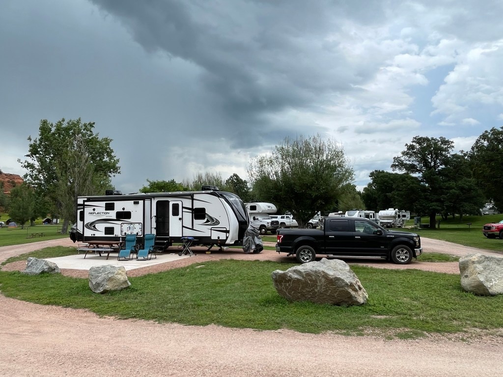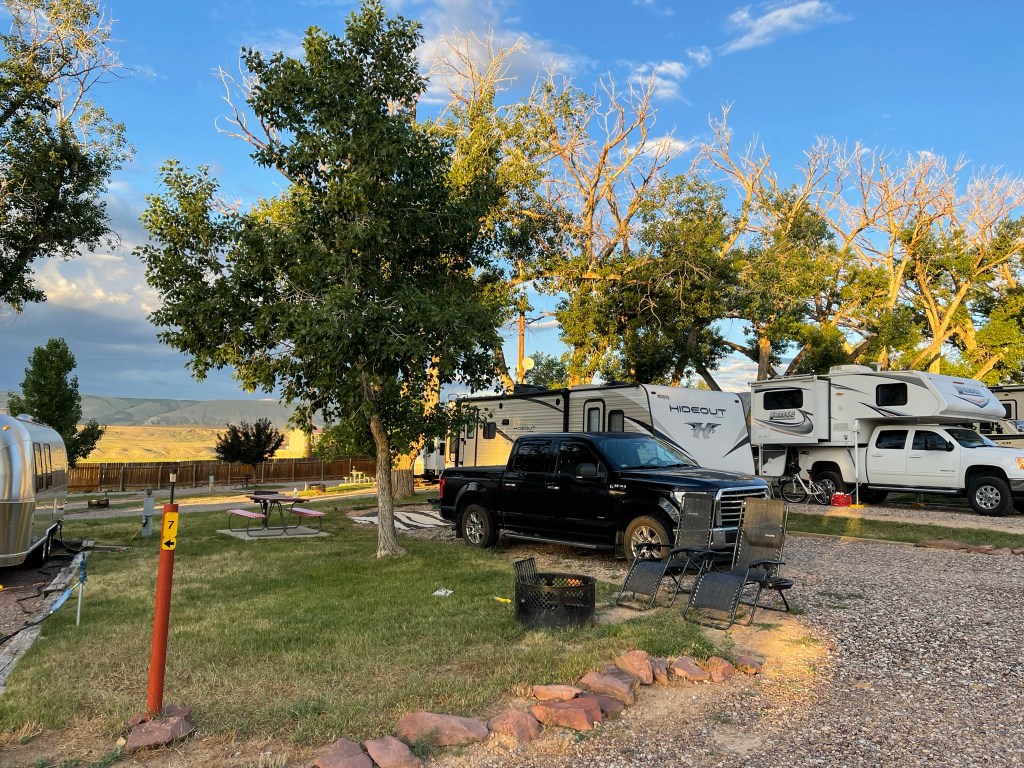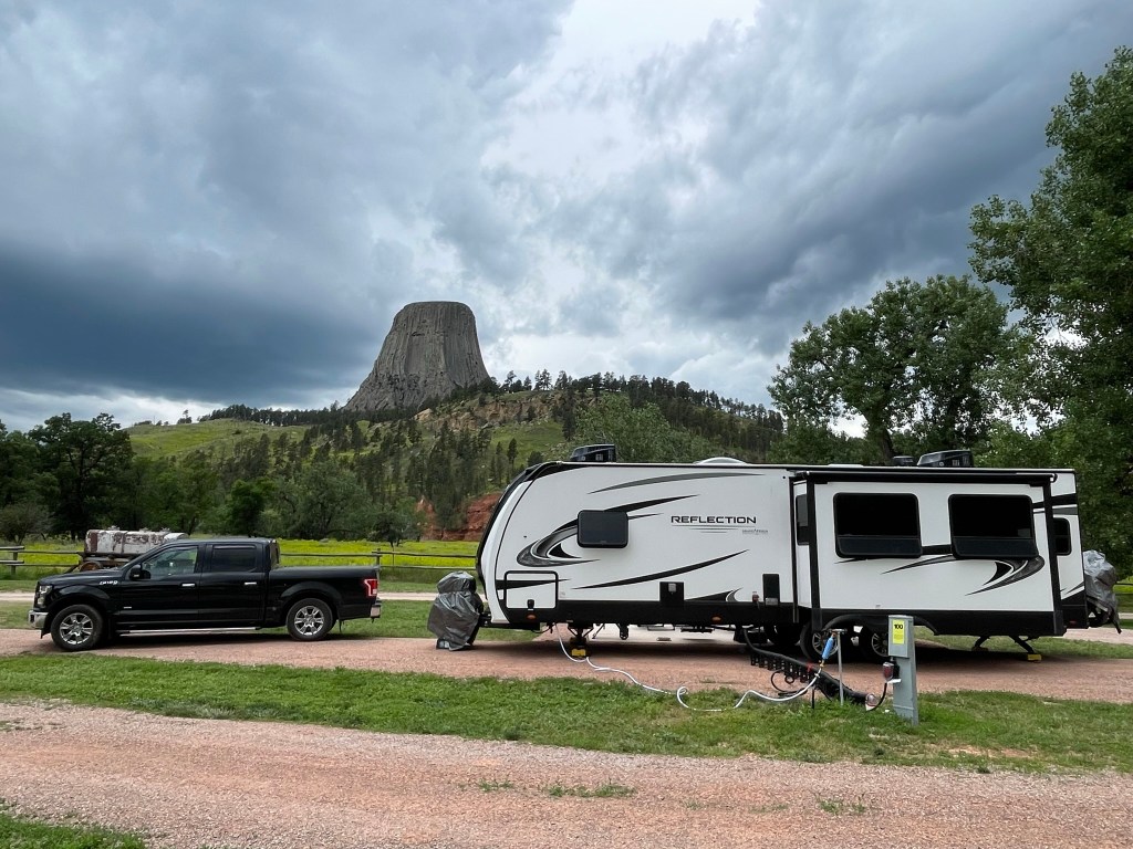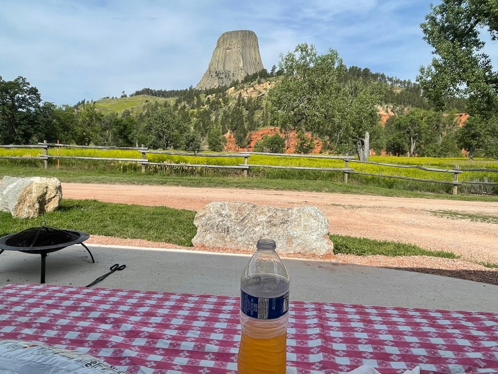 We stayed at the Devils Tower KOA, site 100, which I was told is the closet you can camp to the tower. I booked it in November, the first day it was available, so I could grab this precious site. I knew this was the site because a lot of other campers came by our site to take pictures. This KOA is at 3850′ and had a full camp store and even a full cafe that if you stayed at the KOA, you got 10% off any kind of meals there. We had full hookups, but the real bonus was that site 100 was the only site with a cement patio. On the outer edge of the campground is the Belle Fourche River which was going pretty strong.
