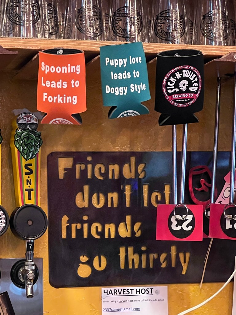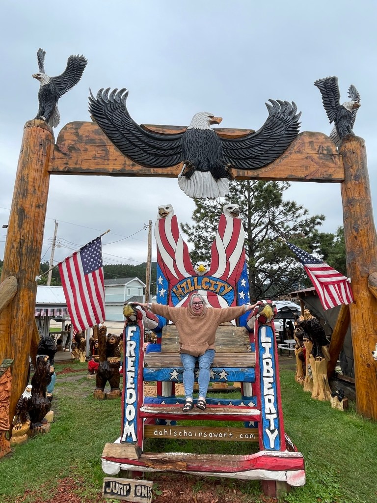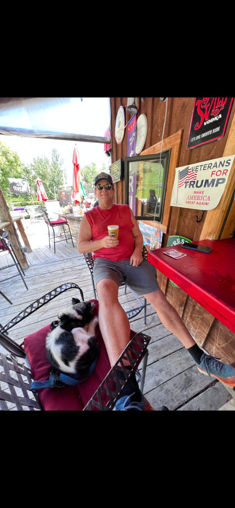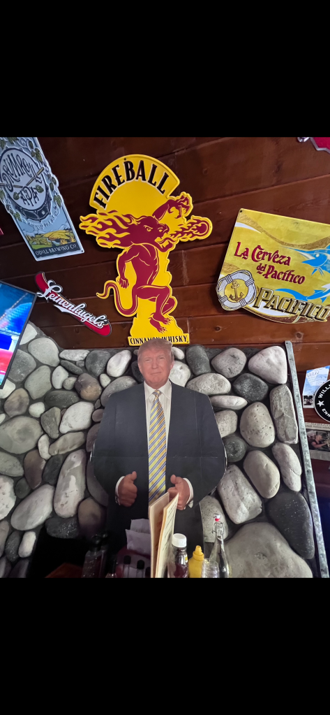 On our way back to our campground, we stopped off at the one and only bar for miles around. Talk about in the middle of nowhere. It was called “Holly’s Road Kill Saloon”. For those Trump fans, this is your Shangri-La. There was a “Trump 2024” flag flying from the roof, a “Keep on Trumping” sign as you approach the bar, and inside a life-size cutout of Trump giving the thumbs up sign. The sign by the road had a deer carcass dangling from it. It looked quite real and had flies around it. Lisa and I figured it was taxidermal, but I wasn’t going to get close enough to see or take a photo of it. Sorry readers. We ate and drank at the outside bar which Holly, the owner, was serving us. Holly was, I’m guessing, 60 and quite weathered for her age. Think of a Harley-Davidson chick from Sturgis in regards to the wardrobe. There were about 7 or 8 tourists and 3 local 25 year old construction workers getting obliterated for lunch. Comforting to know these guys were going to be working on the highway possibly later that afternoon. After about 30 minutes, a car pulled up in front and a woman got out of the passenger seat wearing a mask and walked inside. Holly stopped mid-sentence while talking to us and got this angry look on her face. She met the woman as she entered. “Stop right there!” she said to the masked woman. “We don’t serve your kind here.” I thought maybe we missed some earlier dialogue but no. She said to Holly very politely with a soft spoken voice that she really needed to use the restroom. “No way! You take that mask and get the hell out of here. I want you fucking out of my place right now. I do not have to serve you”. The woman, along with the rest of us, were dumbfounded. The 3 local construction workers were like “right on, Holly, give it to her”. The woman tried again. “I just need to use the restroom and then I’ll leave.” Seemed a reasonable request given that there was not another one for many miles. “I said no!” Holly was screaming at the top of her voice. “Get you and your fucking mask out of here. I mean it. Right fucking now!” After an intense 7 second standoff, the woman shook her head in disbelief and left. We watched her walk back to her car, and the husband rolled down the window. She leaned in the window to tell her husband that they were in the bizarro world. Holly then, believe it or not, lost her shit again when the woman didn’t immediately get in the car and leave. “Mother fucker, ” she said as she threw her cleaning towel angrily towards the floor and stormed off towards the jukebox. She then proceeded to cue up Kid Rock’s “We the People”. For those that don’t know the song, it’s all about anti-vaccine, anti-mask, COVID is a hoax, Fauci hate with the words “mother fucker” or “fuck” every other word. Holly then one upped her crazy, insane self by turning up the volume to 10 both on the inside and outside speakers. When the car drove away, Holly seemed to calm down and went right back to chatting with us as if nothing happened. Sometimes, well, a lot of times as of late, it’s embarrassing being an American. The 60 year old couple next to us seemed frightened at this point and left immediately leaving full plates of food and beer. We didn’t stay much longer either.